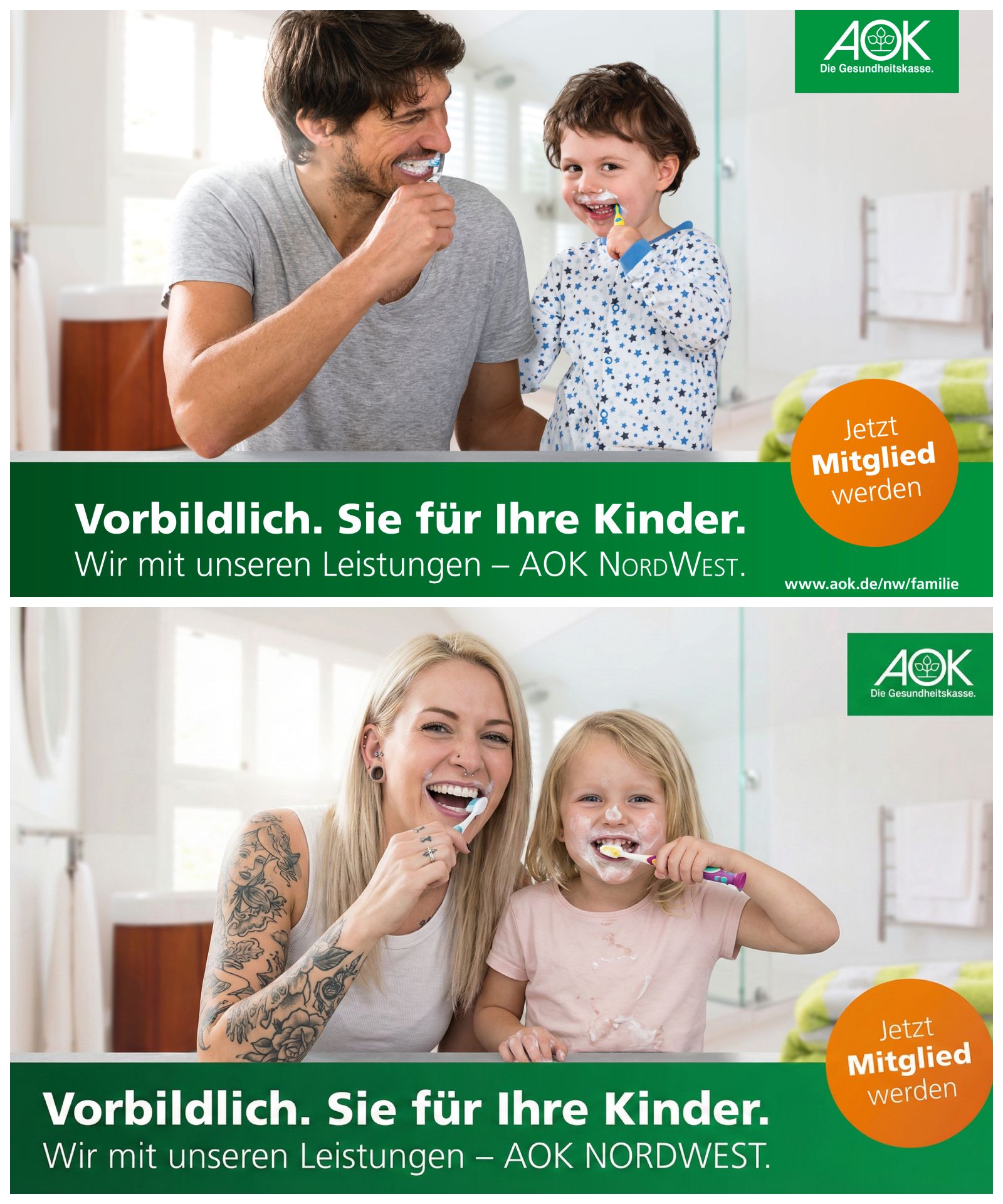 Oben: Original-Kampagne für die AOK. Ich habe die Menschen allerdings vor neutralem Hintergrund im Studio fotografiert, das Badezimmer-Motiv wurde später eingefügt. Bild darunter: Wenn die AOK sich jetzt ein Update wünschen sollte — warum sollte man noch Models und Fotograf buchen, wenn sich ein quasi identisches Ergebnis in 10 Sekunden kostenlos prompten lässt? Gemini hat sogar den Text mit übernommen. Wirklich authentischer ist das Motiv unten auch nicht.