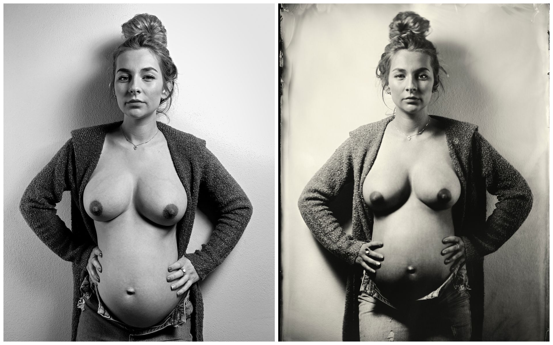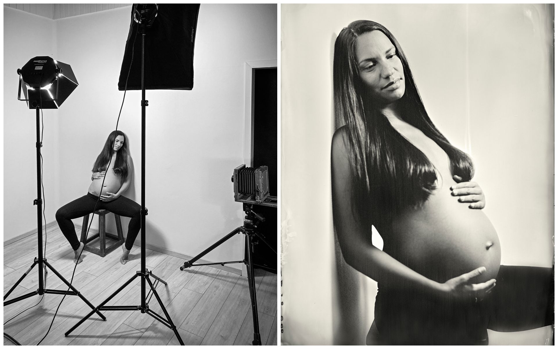 Nassplatten-Aufnahme einer Schwangeren; der Aufbau dokumentiert mit dem Smartphone